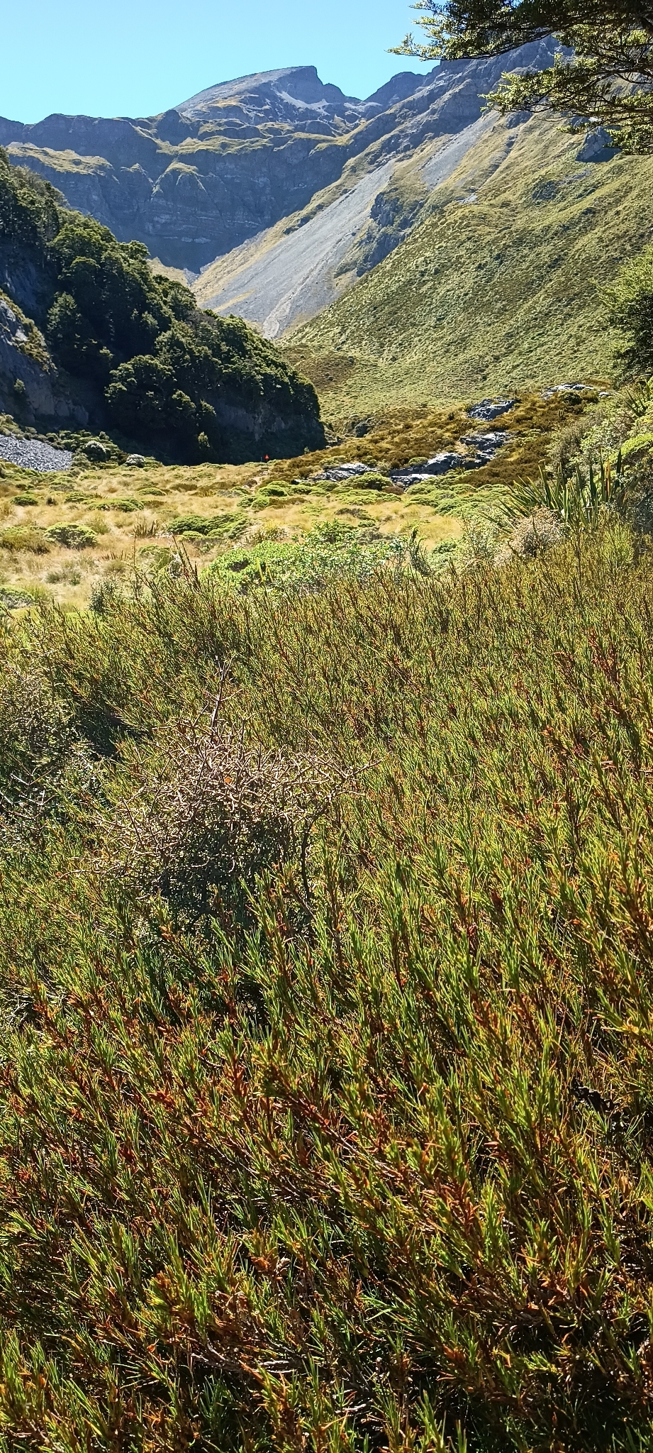 A low, broom-like heath with narrow, tough leaves and airy clusters of small tubular flowers. In Tongariro it grows in fellfield and scrub margins where it weathers wind and frost as a woody subshrub.