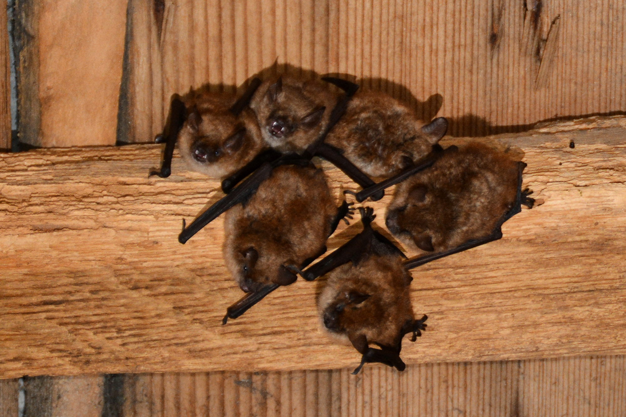 - Common Pipistrelle Pipistrellus pipistrellus Pipistrelles are much smaller with faster, fluttering flight; Myotis myotis is larger with slower, more direct flight and different roosting habits.