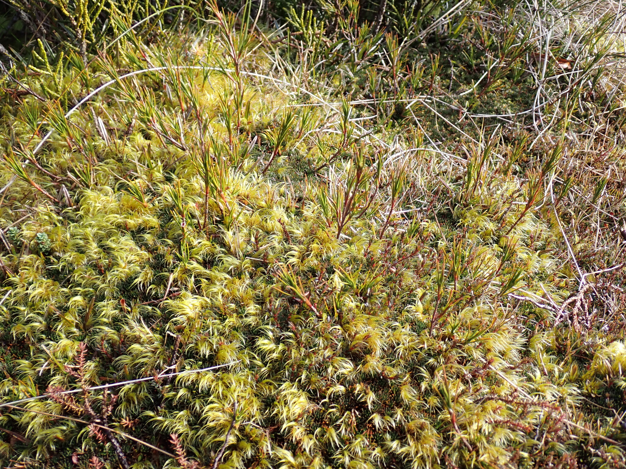- Moss Mat Racomitrium spp. Moss mats are green/grey and non-woody; Dracophyllum has woody stems and persistent leaves.